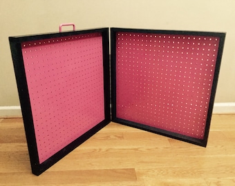 A pink and black geometric-shaped storage box with a handle on the top left corner is open, revealing a pink interior with a grid pattern. The box is placed on a wooden floor against a white wall. | showcase to go travel jewelry display case pink n black 24x4x48 | 3fee313e3a671e84a91b1db43187eacc504e95b3bb479d0eb383927a29ec1d5a | 000000013953 | 0 | 0 | 37 | 11 | 0 | 0 | |