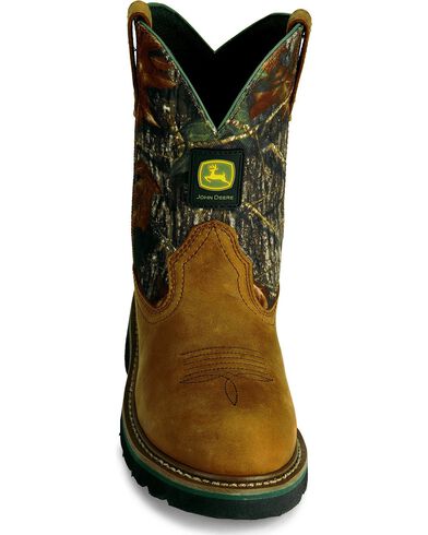 A pair of brown and green camouflage boots with a yellow logo on the side and a black interior lining. | John Deere Youth Boys' Camouflage Boot - Round Toe, Camouflage, hi-res | 62f85281d3c9286783fdf3a6bc4fb292a6ba42e437b8ce0741973361928a60b8 | 000000014094 | 0 | 0 | 20 | 11 | 0 | 0 | |