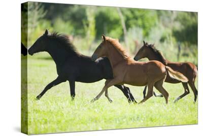 A framed picture of three horses running in a field. The horse in the foreground is black with a flowing mane, followed by a brown horse with a white blaze on its face, and a third horse that is also brown. The background features a blurred green landscape with trees. | Peruvian Paso Colts Running-DLILLC-Stretched Canvas Print | afb383ead5c16e3cc504814d0e6f2ef3416a64bfa3e57983f9339f3fdfa4fb99 | 000000014355 | 0 | 0 | 50 | 6 | 0 | 0 | |
