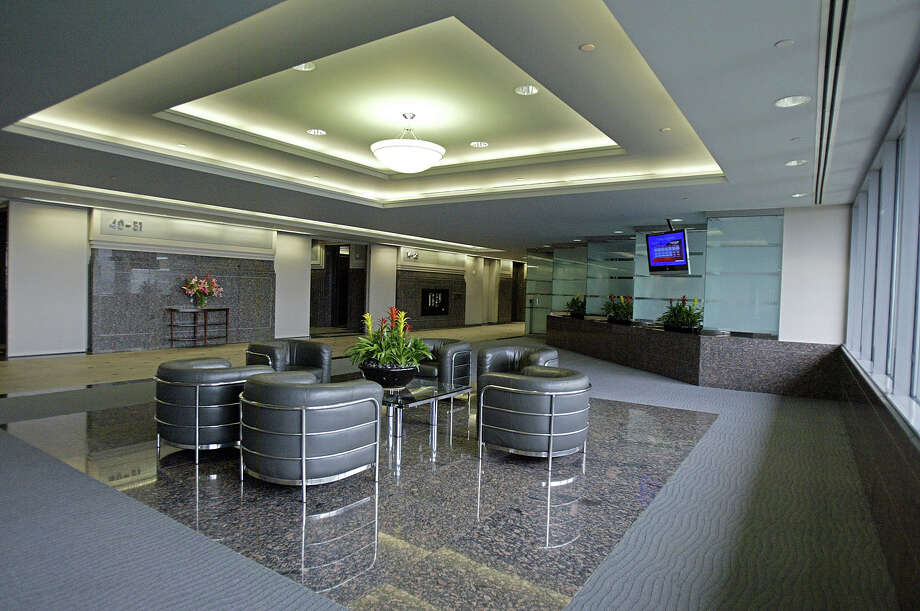 A modern lobby with a high ceiling, featuring a large chandelier and recessed lighting. The walls are adorned with framed pictures and a decorative mirror. A reception desk with a flat-screen TV is situated on the right side. In the center, there is a seating area with four black leather chairs arranged around a glass table. A potted plant with red flowers is placed on the table. The floor is covered with a reflective marble-like material, and the overall ambiance is clean and contemporary. | July 19, 2005 Heritage Plaza is being sold to a group out of Atlanta this week as Texaco, who was acquired by Chevron, is moving out of the building. Pictured here is the sky lobby. Photo: Jessica Kourkounis, For The Chronicle / Freelance | 3eb374aaedeb6a409d4e2722373d335c16d62165880ef616c2fc0627aba47134 | 000000014375 | 0 | 0 | 84 | 43 | 0 | 0 | |