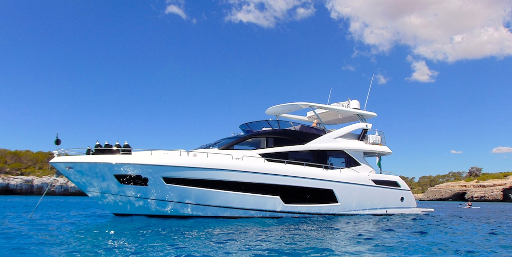 A modern white yacht with a sleek design and a large cabin is cruising on the open sea under a clear blue sky with a few clouds. The yacht has multiple decks, a large windshield, and is equipped with a radar antenna on top. The water is calm, and the yacht is surrounded by a serene environment with no other boats or people in sight. | Charter Yacht GLASAX | Sunseeker 75 Yacht | 4 Cabins | Palma de Mallorca | Ibiza | Formentera | Balearics | 7bfbd19874c84a3f59b725054ab59846a4ed1037de198968854dde972ca2cea4 | 000000014301 | 0 | 0 | 65 | 20 | 0 | 0 | |