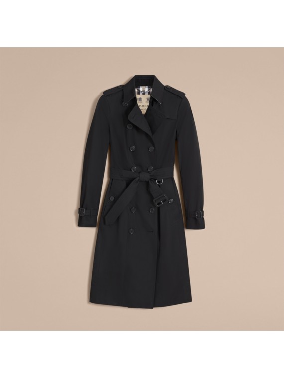 A black trench coat with a belt and buttons is displayed against a beige background. The coat is unzipped, showing a white label inside. The sleeves are rolled up, and the coat is positioned with the left side facing the viewer. | The Sandringham \xe2\x80\x93 Trench Heritage extra-long (Noir) - Femme | Burberry - cell image 3 | 72daa3230a3039c2dad36f2acf36adfea125c7190704cddb150a06f3e40bbd20 | 000000014508 | 0 | 0 | 41 | 15 | 0 | 0 | |