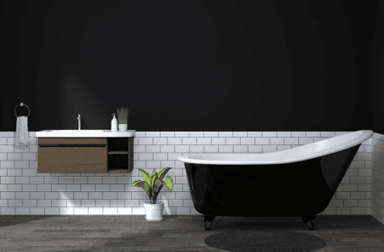 A modern bathroom with a black freestanding bathtub, a wooden vanity with a sink and storage, a white tiled wall, and a black tiled floor. There is a potted plant on the floor next to the bathtub. | How To Renovate A Bathroom | 6d24cf11a6afc05b7e4aa1256ef554976a313dcec0840191beb19c2cdf54519a | 000000014363 | 0 | 0 | 37 | 5 | 0 | 0 | |