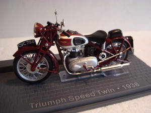 A detailed model of a vintage motorcycle is displayed on a white background. The motorcycle has a red frame with a black seat and a silver engine. It features a round headlight, a small front fender, and a license plate that reads 'CYC 650'. The model is accompanied by a plaque that reads 'TRIUMPH SPEED TWIN 1938'. | Triumph Speed Twin 1938 rot 1:24 IXO | f0c5c3de5706811fca043f8b75f0ac829262e649fac0506da203f7ce1b737d9c | 000000014522 | 0 | 0 | 57 | 7 | 0 | 0 | |