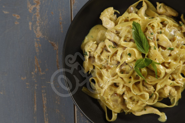 A plate of fettuccine pasta with a creamy sauce, topped with chicken, mushrooms, and garnished with basil leaves. The plate is on a wooden surface with a blue background. | Fettucine Pollo Alfredo | 04bacd97060bb00276828ccf243d4bea090f10fba0e894a9dc1bad878ce31400 | 000000014403 | 0 | 0 | 29 | 3 | 0 | 0 | |