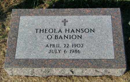 A granite headstone with a cross on top, featuring the name 'Theola Hanson O'Banion' and the dates 'April 22, 1902 - July 6, 1968'. The headstone is set in a grassy area with a small patch of dirt visible at the bottom. | HANSON O'BANION, THEOLA - Lincoln County, South Dakota | THEOLA HANSON O'BANION - South Dakota Gravestone Photos | aa330d4471907fa6bed8779ca0e13fb2849735946d5b94e1b3e25060c022cc3c | 000000014399 | 0 | 0 | 42 | 17 | 0 | 0 | |