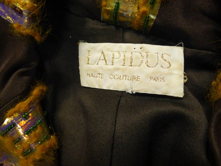 A close-up view of a garment with a label that reads 'LAPIDUS HAUTE COUTURE PARIS'. The label is attached to a dark brown fabric with a textured surface. The fabric appears to be made of a luxurious material, possibly silk or velvet, and has a shiny, reflective quality. The label is sewn onto the garment, and the fabric has a ribbed texture with a subtle sheen. | Ted Lapidus Haute Couture Skirt Set by Olivier Lapidus Circa 1990 For Sale 9 | 5b79745eef4e84cfd1627b430d6a28a95d9be98f2390a858a78d3195424fd3f0 | 000000014605 | 0 | 0 | 66 | 14 | 0 | 0 | |
