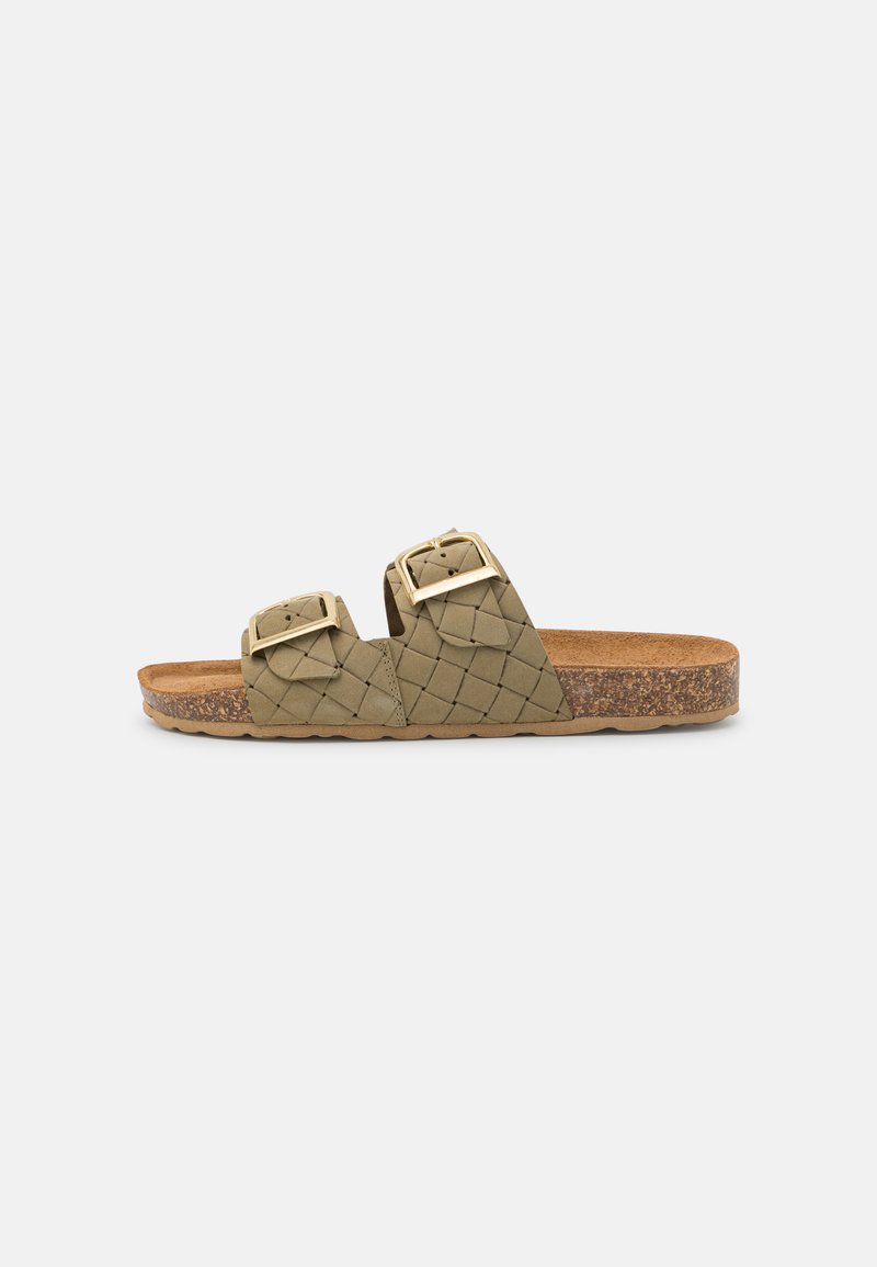 A pair of brown leather sandals with a woven pattern on the upper part and a wooden sole. | Women Trainers | Marco Tozzi Mules - olive/khaki - KB26056 | 40ef97d214d9d9fbfb55f0a20949c3320a5c985f6b3815f4e8a89071af3b007d | 000000014554 | 0 | 0 | 18 | 10 | 0 | 0 | |