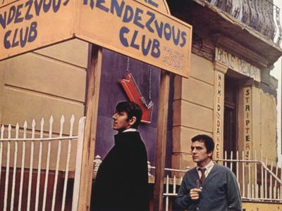 A black and white photograph of two men standing in front of a building with a sign that reads 'RENDEZVOUS CLUB'. The man on the left is wearing a black suit and tie, and the man on the right is wearing a green sweater and a white shirt with a tie. Both men are holding umbrellas. | Bedazzled, Peter Cook, Dudley Moore, 1967 | 6d40e89f756f2e70919b9e1568567ee7e4fb4953ab90f6983e058a2565e9d4af | 000000014598 | 0 | 0 | 56 | 6 | 0 | 0 | |