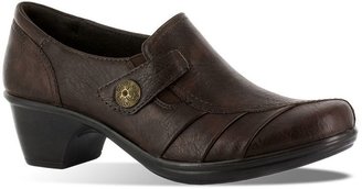 A pair of brown leather loafers with a round gold buckle on the left shoe and a black sole. | Easy Street Shoes Emery Slip-On Shoes - Women | d14972e2b225d2794566546660714259a47fbebf2cfaae4bd6bbe98715e0b40e | 000000014701 | 0 | 0 | 19 | 8 | 0 | 0 | |