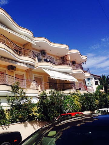 A Mediterranean-style building with a curved roofline and multiple balconies is surrounded by lush greenery. The building has a beige exterior with white trim and is adorned with a white awning on the second floor. The sky is clear and blue, and there are no visible people or vehicles in the immediate vicinity. | Cozy appartment in Pefkochori Chalkidiki - Pefkochori - Leilighet | 990a39da40cc041b4f47300d5dd735c9449be4f94522af895ba26f795e2b5ea0 | 000000015316 | 0 | 0 | 53 | 9 | 0 | 0 | |