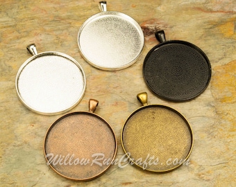 A collection of four different colored metal charms with a textured surface, each with a circular shape and a hole at the top for attachment. The charms are arranged in a square formation on a textured surface, with the top charm being silver, the second from the top being white, the third from the top being black, and the bottom charm being gold. | 20 pcs 38mm Circle Pendant Trays Antique Bronze, Antique Copper, Silver and Black, Blank Bezel Cabochon Setting | 4e8dfa5b6019e46b766857acb36966403c74fd8abbd74fe45235236b85ba7530 | 000000015381 | 0 | 0 | 63 | 17 | 0 | 0 | |