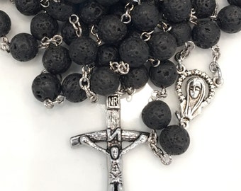 A close-up of a rosary with a crucifix pendant, featuring a detailed silver cross with a black background. The rosary beads are black with a metallic finish, and there are two silver rings connecting the beads. The crucifix has a detailed design with a figure of Christ on the cross, and the word 'NR' is engraved on the lower part of the cross. | Catholic rosary | f8a5e3c1be84f40aad3bed6879ca8fa630e4890d48434a4fed69740f184b5dc9 | 000000015324 | 0 | 0 | 63 | 2 | 0 | 0 | |