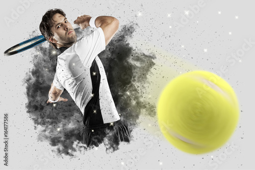 The second image shows the same man in a similar pose, but now he is holding a tennis racket with a blue and black design. The background has been transformed into a dynamic scene with a tennis ball in motion, emitting a trail of light particles. The color scheme is more vibrant, with the man's shirt now predominantly white and black, and the background featuring a mix of dark and light tones. The image has a more energetic and active feel compared to the first. | Aluminium Tennis Tennis Player coming out of a blast of smoke . | a81f706095faeb68f2ae5dcfba16aed16096f2c441a6f2c62f1c042717580bd4 | 000000015394 | 0 | 0 | 85 | 12 | 0 | 0 | |