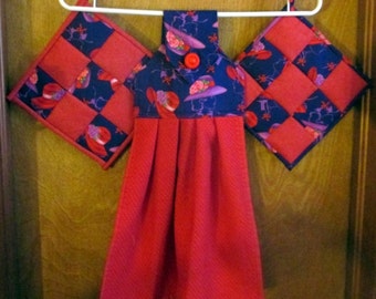 A red dress with a floral pattern is hanging on a wooden hanger. The dress has a red skirt and a blue top with a red bow at the waist. There are two red and blue checkered napkins hanging on either side of the dress. | Tea Towel and matching Pot Holder Set - Red Hat | 2146a054a09b8051e2d9800ae33f65f2462f780aabaa82e182b6163f6bebb6a1 | 000000016241 | 0 | 0 | 45 | 10 | 0 | 0 | |