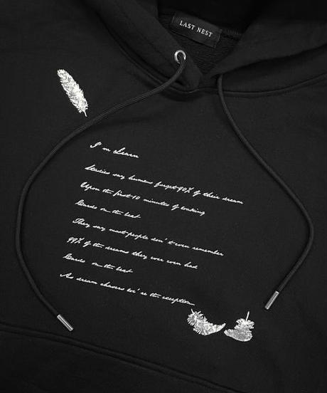 A black hoodie with a poem written on the front in white cursive script. The poem is titled 'I am a leaf' and describes the speaker's desire to be free and to fly like a leaf. There are two small, detailed illustrations of leaves on the left side of the hoodie, one above the other. The hoodie has a zipper and a tag that reads 'Lasy Nest'. | LAST NEST / dreaming hoodie | 0fc52269c588e87015bcccaf31a09854d3e1a1a78723df59e4effd4155898ffa | 000000016469 | 0 | 0 | 67 | 5 | 0 | 0 | |