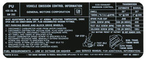 A black and white technical manual page with various diagrams and text. The top left corner has the text 'PU' and 'VEHICLE EMISSION CONTROL INFORMATION'. Below this, there is a company name 'GENERAL MOTORS CORPORATION' and a model number '2A'. The page includes diagrams of a car's engine, a block diagram, and a table with measurements. There are also text descriptions and annotations throughout the page. | 1972-1972 LeMans Emissions Decal 400-2V AT/MT (PU, #490617) | a9356b079b793e2b4ffb434ee9a27a39c4055cd506d6cf48b1dd18d901f7f34e | 000000016514 | 0 | 0 | 66 | 8 | 0 | 0 | |