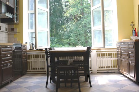 A wooden dining chair with a straight back and four legs is positioned in a room with a large window, tiled floor, and a kitchen with cabinets and a stove in the background. | Beautiful Russian country house - Nikolina Gora - Hus | fd0426897c586f3332c0785e8223e06e478ec14ca0c18a0fa03d73151f3a7b97 | 000000016715 | 0 | 0 | 33 | 9 | 0 | 0 | |