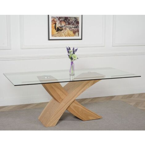 A modern glass coffee table with a wooden base and a vase of flowers on top is displayed in a showroom. | Valencia Oak 200cm Wood and Glass Dining Table | dfaa6e6cfd3e4fa1b87356f539148e3c525ede11394df089a72bc1492f7c7c4b | 000000016648 | 0 | 0 | 21 | 8 | 0 | 0 | |