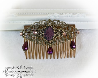 A close-up image of a vintage hair accessory with intricate metalwork and a large, ornate purple gemstone in the center. The accessory has multiple smaller red gemstones and is mounted on a white background with a decorative border at the bottom. | Bronze victorian cameo hair comb with purple details-victorian haircomb-victorian hairclip-victorian gothic jewely-victorian headpiece | 80c6092f815e8a02ab99c5321b1ca96366a48ca5386afaab441383769a5040bf | 000000016663 | 0 | 0 | 41 | 13 | 0 | 0 | |