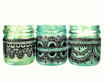 Three glass jars with intricate black and white patterns are arranged in a row. The jars are filled with a teal-colored liquid, and each jar has a lit candle inside, casting a warm glow and creating a soft reflection on the glass. | Mini Mason Jar Candles, Gift for Her, Boho Decor Candles, Three Moroccan Jar Candles- Green Glass with Soy Candle, Black Lace Detailing | 4be4154cca98c9a9aed34aefe05dd06fba86f831e56ee42de31faefc33176119 | 000000016708 | 0 | 0 | 42 | 22 | 0 | 0 | |