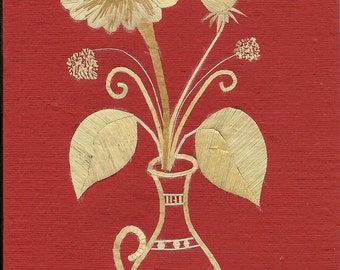 A watercolor painting of a vase with a bouquet of flowers on a red background. The vase is depicted with a textured appearance, and the flowers have a soft, blended look. The leaves are detailed with visible veins, and the stems are adorned with decorative swirls. The background is a solid red color, and the painting has a warm, artistic feel. | Not a Print, photo or painting But Handmade with leaves of rice plant. FLOWER Bouquet made with leaves. | e2ca2daee9369a6865fa0181dae1f60d6853e73c3e2a46ce17128e990b469625 | 000000017726 | 0 | 0 | 61 | 18 | 0 | 0 | |
