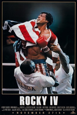 The second image is a close-up of a boxer celebrating a victory in the ring. The boxer is wearing red and white boxing gloves and shorts, and he is holding an American flag. The background is dark, and the focus is on the boxer's triumphant expression and the flag. The image is framed with a title that reads 'ROCKY IV' and a date 'NOVEMBER 27TH'. | Rocky IV 411X17 Original Movie Poster Stallone Burt Young | 2c382fa8dc763b4b670f0aa310a8c0d7d6fda6f5b238b28362653d5faff54fb6 | 000000018230 | 0 | 0 | 65 | 9 | 0 | 0 | |