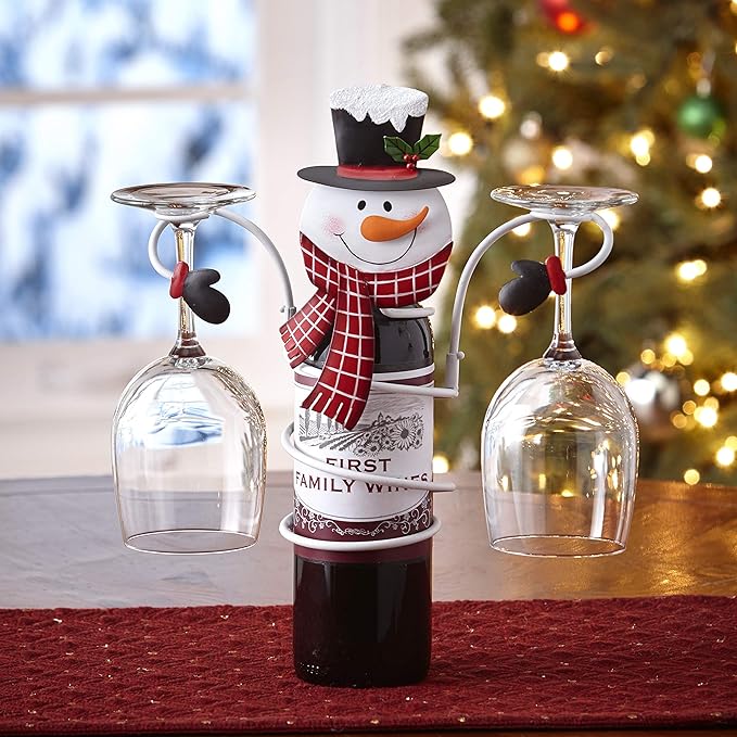 A snowman figurine with a black top hat, a red scarf, and a carrot nose is standing on a wooden table. The snowman is holding two wine glasses, one in each hand. The table is covered with a red and white checkered tablecloth, and there is a Christmas tree with lights in the background. | Snowman The Lakeside Collection Wine Bottle and Glass Holder | 4d0ae218a0ba1fc027daea419deb6c99219232b5d31adb40de8b2ee3c8654a3c | 000000018202 | 0 | 0 | 54 | 9 | 0 | 0 | |