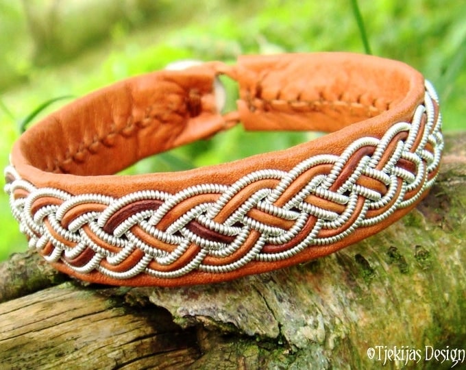 A brown leather bracelet with a braided design and silver accents is resting on a wooden surface. The background is blurred with hints of greenery, suggesting a natural setting. | Leather Viking Bracelet Cuff FREKI Bark Brown Reindeer decorated with Pewter Braid and Custom Handmade to Your Wishes | dd14ea6f7d003604dd942db0fac05837b3a142771e8287941ca8b6555d5f39c9 | 000000018221 | 0 | 0 | 29 | 18 | 0 | 0 | |