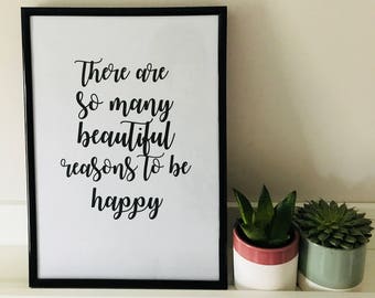 A framed picture with a black border is displayed on a shelf. The picture contains a quote in cursive script that reads, 'There are so many beautiful reasons to be happy.' The quote is in a dark color on a white background. Below the quote, there is a smaller text that reads, 'Reasons to be happy.' The picture is accompanied by two potted plants, one on each side, with the left plant having a more rounded shape and the right plant having a more pointed shape. | There are so many beautiful reasons to be happy - Black & white Print | f3157746db9670156df50074c684e3af9e5d36b575a4b1409a31ad1775c6b339 | 000000018399 | 0 | 0 | 86 | 14 | 0 | 0 | |