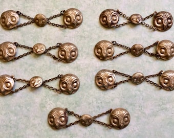 A collection of ornate silver owl-shaped charms with intricate details and a chain-like design, arranged in a row on a textured green background. | Vintage 3 Part Silver Metal Owls Cape Closures c1940 | f7f0f021454ef420ee3e809a1b0732525e9118a9fc83bf3ddbea038b0611353d | 000000018369 | 0 | 0 | 23 | 9 | 0 | 0 | |
