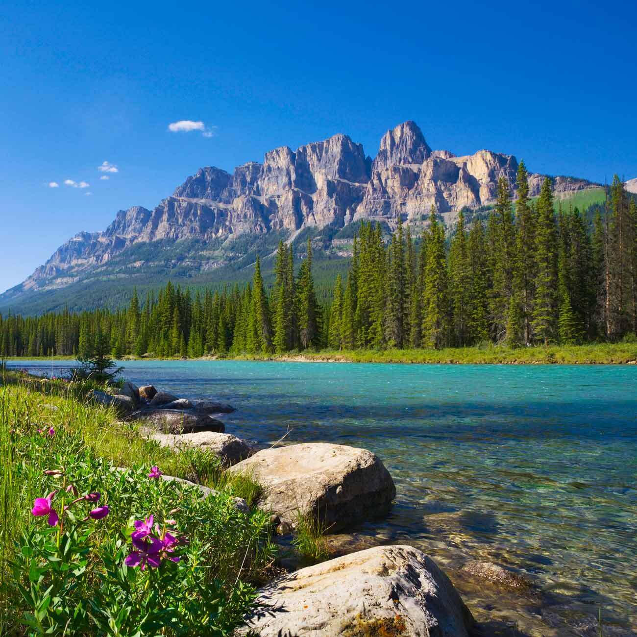 A serene mountain landscape with a clear blue sky, featuring a prominent mountain peak with sharp ridges and a forest of evergreen trees in the foreground. A calm river flows through the valley, with a few rocks visible in the water. | Canadas East to West with Alaska Cruise Verandah Cabin Summer 2019 | f88db9734387934a6184c54557dcbb11fa48a9912d0b1ca76c5266d7b55f5709 | 000000018646 | 0 | 0 | 41 | 11 | 0 | 0 | |