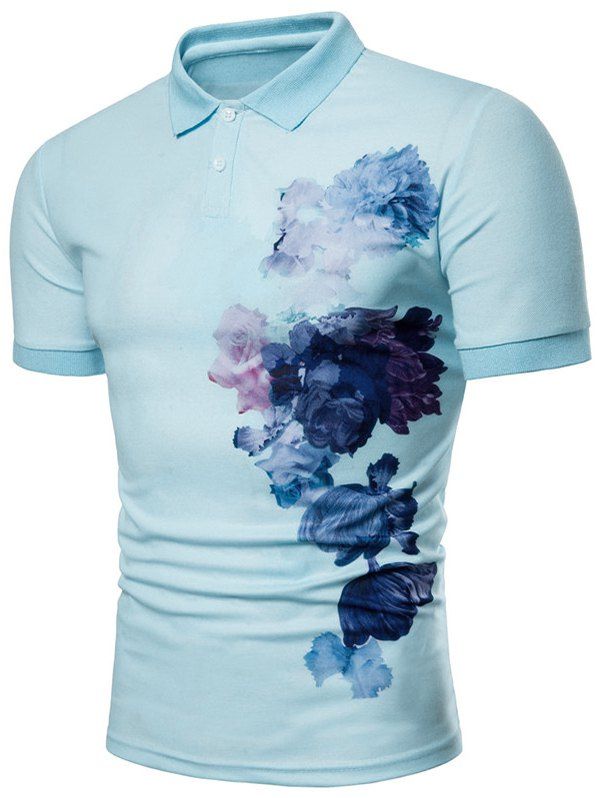 A mannequin wearing a light blue polo shirt with a floral pattern on the front. The pattern consists of various shades of blue and purple flowers and leaves, with some pink accents. The shirt has a collar and is buttoned up. The mannequin is standing against a white background. | Shops Side Flowers Painting Print Casual Polo Shirt | 553c9e19b9975057310a28232d063830f0625d9231558a376fb70582f8840d04 | 000000018643 | 0 | 0 | 49 | 8 | 0 | 0 | |