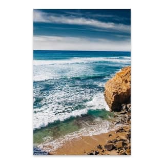 A serene beach scene with gentle waves lapping onto the shore. The ocean is a deep blue, and the sky is partly cloudy with a few wispy clouds. The beach is sandy with some rocks scattered near the water's edge. | Noir Gallery San Diego California Beach Photo Metal Wall Art Print | 76a0a12d9d23afe80ab47bc3ffc84f092da0fc7e3aa7792a5f5de7501a1361e5 | 000000018733 | 0 | 0 | 40 | 11 | 0 | 0 | |