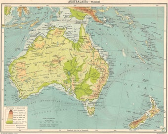 A vintage-style map of Australia and the surrounding region, featuring a color scheme with shades of green, blue, and brown. The map includes detailed topographical features, such as mountain ranges and coastlines, as well as a legend and grid lines. The map is oriented with the top pointing towards the north. | Australia Map 1920s old maps home decor Vintage Prints old maps rail map | fbde5dca85809ff05b9003ddb843060428f7924e5533218f9d137a7877b7bea8 | 000000018698 | 0 | 0 | 51 | 13 | 0 | 0 | |