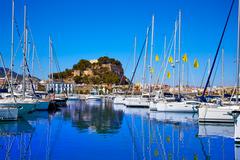 A serene harbor scene with numerous sailboats docked in the water. The sky is clear and blue, and the sun is not visible. The boats are of various sizes, and some have yellow flags on their masts. The water is calm, reflecting the boats and the clear sky. In the background, there is a hill with a building on top, and the overall atmosphere is peaceful and still. | Denia marina Port and Castle in Alicante at Spain Stock Photos | 35600cca68ecdd37ba6c562544772c761e7caa6db1534b3757464983b91ea621 | 000000018817 | 0 | 0 | 68 | 11 | 0 | 0 | |