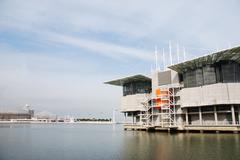 A modern building with a flat roof and large glass windows is situated on a pier over a calm body of water. The sky is partly cloudy, and there are no visible people or boats in the vicinity. | Oceanarium building in lisbon Stock Photos | 08658c1e26bf0603b0638e61f3877db1e93e0a675571d8384efd0589d2aadb8a | 000000019104 | 0 | 0 | 38 | 6 | 0 | 0 | |