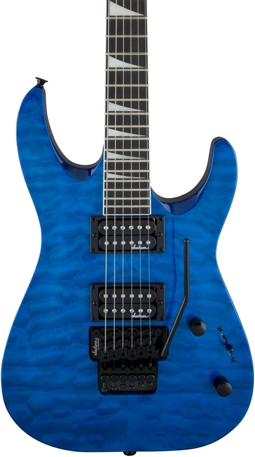 A blue electric guitar with a glossy finish and a black pickguard is displayed against a white background. The guitar has a headstock with tuning pegs and a fretboard with inlays. The body of the guitar features a patterned design, and the neck is adorned with a fretboard. The guitar has a black bridge and a black tailpiece. | Jackson JS Series JS32Q DKA Dinky Arch Top Transparent Blue B01MY9T5LI | c0ef1c8d7dbdc32b53632b9c646a5c0500fb8f24896250715b8a59c2396ee8f7 | 000000019054 | 0 | 0 | 58 | 11 | 0 | 0 | |