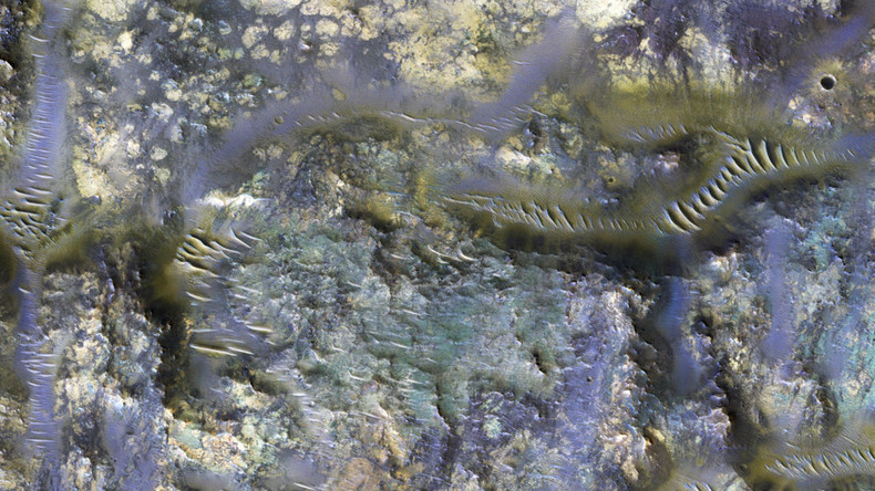 A close-up of a rocky surface with a variety of textures and colors. The surface has a mix of smooth and rough areas, with some parts appearing to be covered in a fine, powdery substance. The colors range from dark blues and greens to lighter shades of yellow and orange. There are also some darker, more defined lines and patterns that give the surface a complex and intricate appearance. | Martian technicolor worms? NASA reveals incredible snap of Mars crater | 0930a8351125695e986cb096ded2896b2c26558e12de1cbcce175e9bf7b510ef | 000000019009 | 0 | 0 | 69 | 10 | 0 | 0 | |