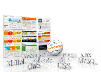 A collection of web design-related items is displayed against a white background. In the center, there is a large white sphere with the text 'WEBDESIGN' written on it. Surrounding the sphere are various smaller items, each with a different text label: 'HTML', 'JAVASCRIPT', 'JQUERY', 'PHP', 'MYSQL', 'CSS', and 'CMS'. These labels are in a metallic font and appear to be floating above the ground. The items are arranged in a way that suggests a web design workflow, with the sphere representing the final product and the smaller items representing the tools and technologies used to create it | Webdesign, Templates, Programmiersprachen, Website, Homepage, 3D | f4288d2f73fb481586ecf32c90db987e1b2c5a3b9c312cce084aafeed0ab0225 | 000000019017 | 0 | 0 | 97 | 6 | 0 | 0 | |