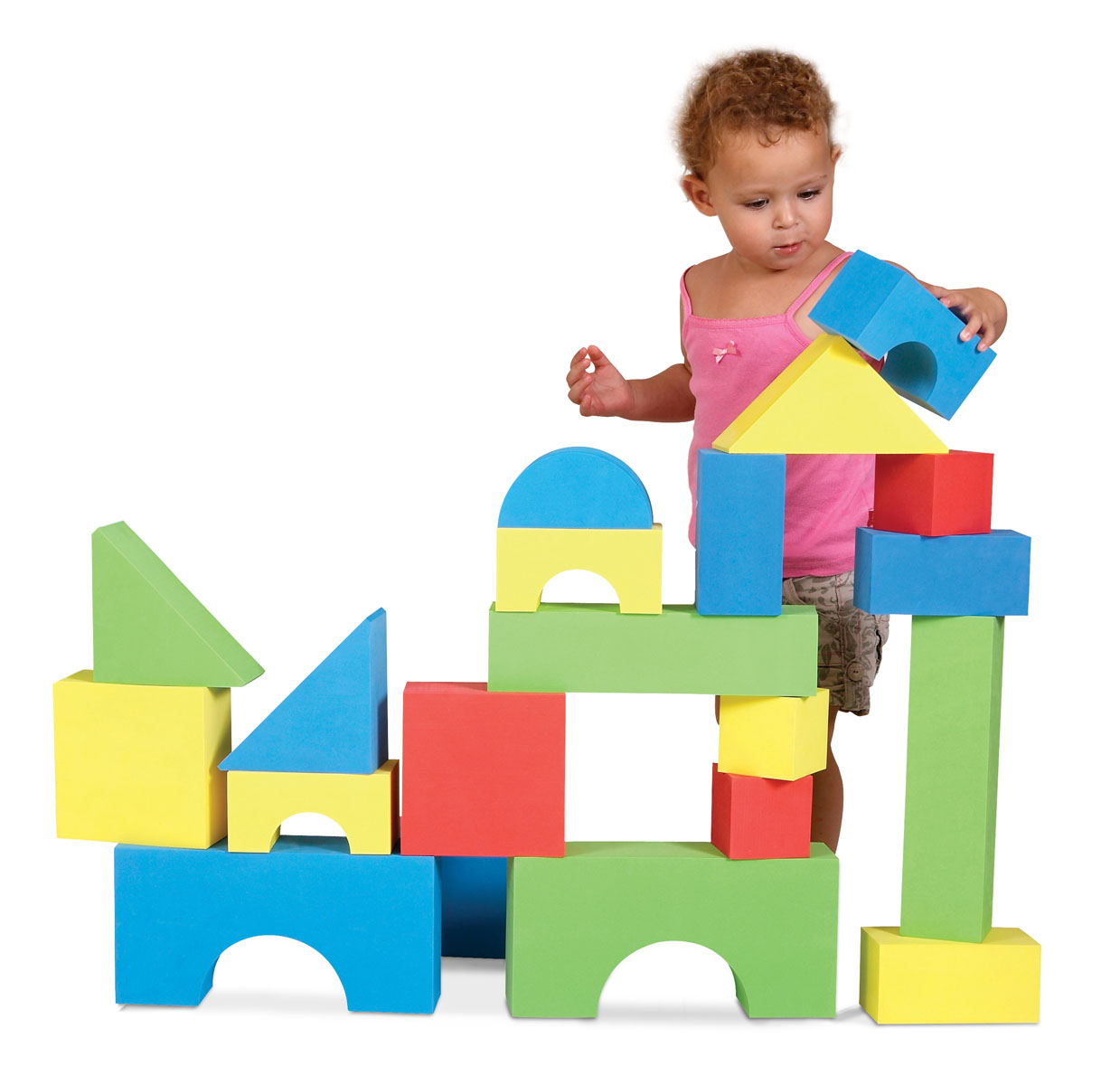 A young child is playing with a colorful wooden block tower. The tower consists of various blocks stacked on top of each other, with a mix of blue, green, yellow, and red blocks. The child is wearing a pink tank top and is standing to the right of the tower, holding a blue block in their right hand. The child appears to be in the process of adding the block to the tower. The background is a plain white surface. | Big EduColor Blocks | f8d79c13c4ce74bc8e6e5910de36dd23e46fbaa809970b9364d1882ef839cefa | 000000018987 | 0 | 0 | 80 | 3 | 0 | 0 | |