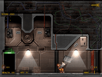 The second image shows the same corridor with a different color scheme and lighting. The walls are now a dark gray, and the floor is a lighter gray. The lighting is dimmer, with a spotlight effect on the right side of the corridor, creating a more dramatic atmosphere. The person in the orange jumpsuit is now holding a large, rectangular object, and the person in the blue jumpsuit is holding a smaller, round object. The overall scene has a more intense and mysterious feel compared to the first image. | Video Game: Codename: Gordon | 0b5076740e6d366e89ead4a3b222b5bb27297d5d3b79cff9002a7cabb49e3cb6 | 000000022308 | 0 | 0 | 89 | 4 | 0 | 0 | |