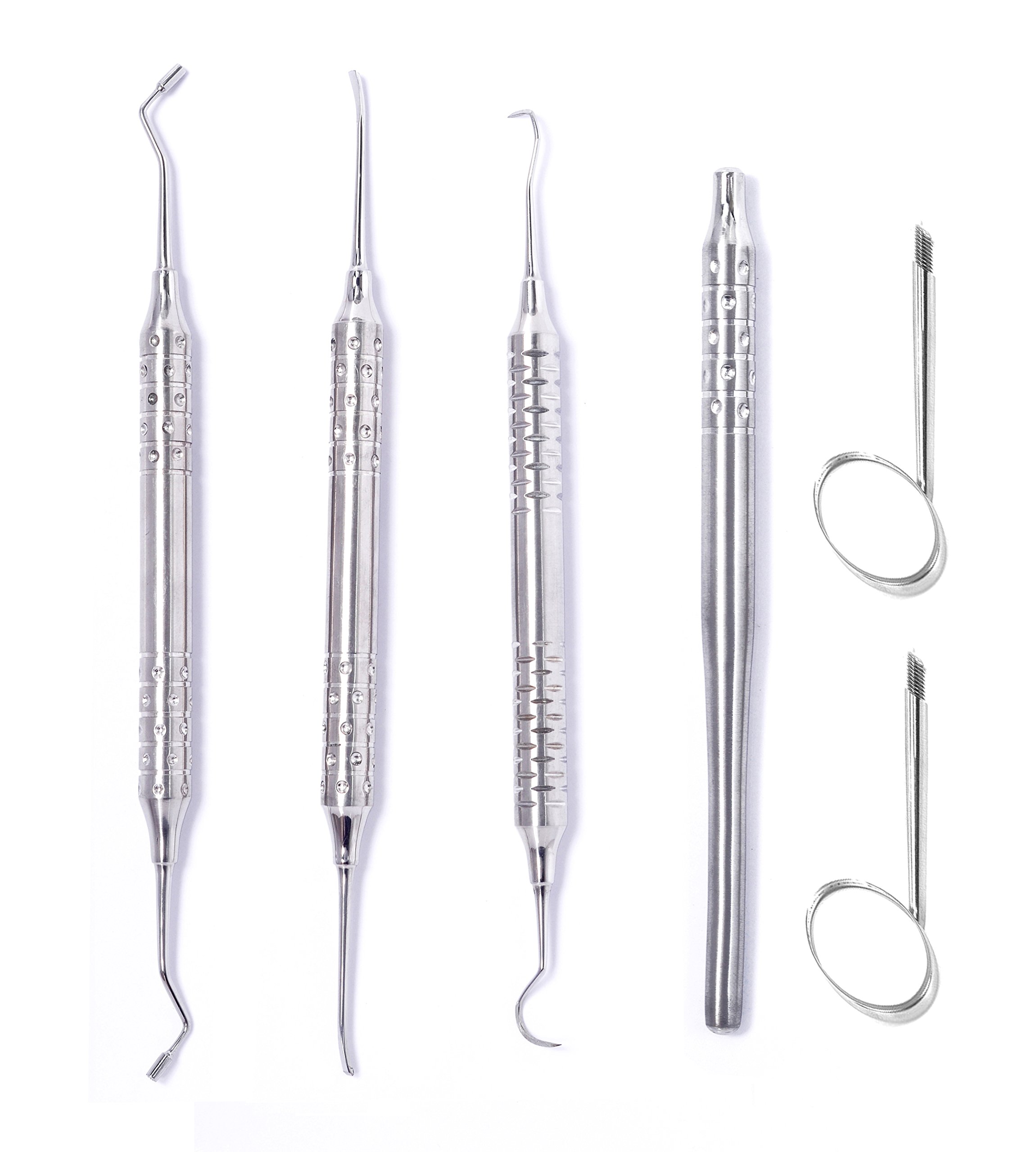 A set of dental tools, including a dental mirror, a dental explorer, and a dental scraper, are displayed on a white background. | ZZZRT 3333 Premium Grade Stainless Steel Dental Tarter Scraper and Remover Scalers Set (3 scalers + 1 mirror handle + 2 Mirror) With Free Protective Packing | e86d5836127665509a3cd41f617be7c6ac0c7521005187a78942292337e0a90d | 000000022213 | 0 | 0 | 22 | 26 | 0 | 0 | |