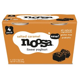 A box of Noosa yogurt with a new label design. The box is orange with a white background and features a black and white illustration of a yogurt cup with a spoon. The label has a new logo and text that reads 'SALTED CARAMEL' and 'FINEST YOGHURT'. There are four compartments in the box, each containing a different flavor of yogurt. The packaging includes a 'NEW!' tag and a list of ingredients. | noosa Yoghurt | 0ffed86497edc97d83b07f798428d551bfd1524ed1ef2df90822550ba1228fcc | 000000022315 | 0 | 0 | 72 | 2 | 0 | 0 | |