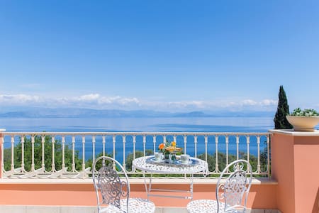 A balcony with a white railing overlooking a calm sea under a clear blue sky. There are two white chairs with intricate designs and a small white table with a vase of flowers on it. The balcony is surrounded by a pink wall, and there is a potted plant to the right. | Greek Villa with the Stunning View - Rumah | add04826e5795a2283ff9a611b8a38a8c0013a85ce743779675146078670f0ca | 000000022628 | 0 | 0 | 52 | 8 | 0 | 0 | |