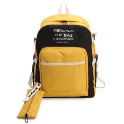 A yellow backpack with a black and white design on the back, featuring the text 'Meng Hua The Bag for You!' and a white logo. The backpack has a black bottom panel, a white zipper pull, and a yellow and black drawstring. There is a yellow and black striped strap hanging from the bottom of the backpack. | Nylon Color Block 2 Pieces Backpack Set - YELLOW | 4dbafe6ca512a91c677e15b3c5ba9c09550d9346e774493ac1b3774e1b85cb9c | 000000022674 | 0 | 0 | 57 | 9 | 0 | 0 | |