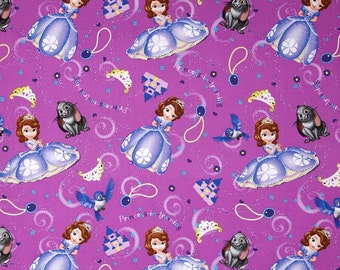A purple fabric with a pattern of various Disney princesses and characters, including Snow White, Cinderella, and Tinker Bell, along with a dog and a cat, is displayed. The fabric has a whimsical design with hearts, swirls, and other decorative elements. | Fat Quarter Disney Sofia Princess in Training Friends Cotton Quilting Fabric | 1442ab5d71d86e473b8c7d5b2b760db1f039c276752ceedd3d307d08ae474926 | 000000022641 | 0 | 0 | 41 | 11 | 0 | 0 | |