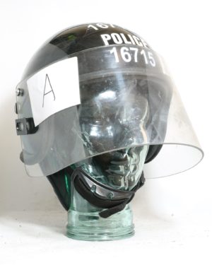 A clear plastic helmet with a reflective surface is displayed on a white background. The helmet has a sticker with the letter 'A' on the left side and the number '167715' on the top. The helmet is placed on a glass base, and the reflection of the helmet and the sticker is visible on the surface of the glass. | British Police Surplus Riot Helmet Armour Black | 6dff56a7bcf47906ca9c3f04b071874d4d7bdfb23c49084d0499d7c134b1d74f | 000000022618 | 0 | 0 | 59 | 7 | 0 | 0 | |