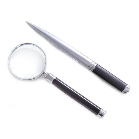A silver magnifying glass and a black fountain pen are placed side by side on a white background. | Duke Leather-handled Metal Magnifier and Letter Opener Set | 057beef70d85a2f50e5b3d2e7ceacef3c784c6f40c342815815d734b846467e4 | 000000023174 | 0 | 0 | 18 | 8 | 0 | 0 | |