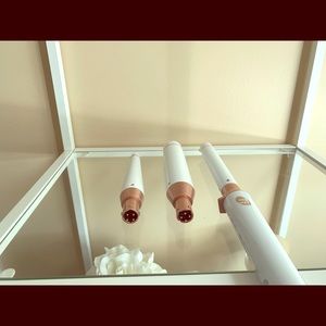 A white vase with a red base is placed on a white shelf, surrounded by other white vases with red bases. The shelf is against a beige wall, and there is a white flower decoration on the shelf below the vases. | Accessories - T3 Whirl Trio Convertible Styling Wand | 31ef7a909679debb5dc86f7289fbb4ce29da4dbfc04da0d0642fe473916433b6 | 000000023206 | 0 | 0 | 41 | 8 | 0 | 0 | |
